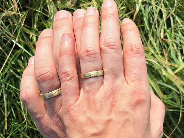 Zwei verschieden schwingende Gravurlinien umspielen einander, vereinen sich und variieren in unterschiedlichen Ringansichten. Dadurch entsteht ein lebendiger, freudvoller Ring, der die emotionalen Beziehungen zwischen zwei Liebenden widerspiegelt.
